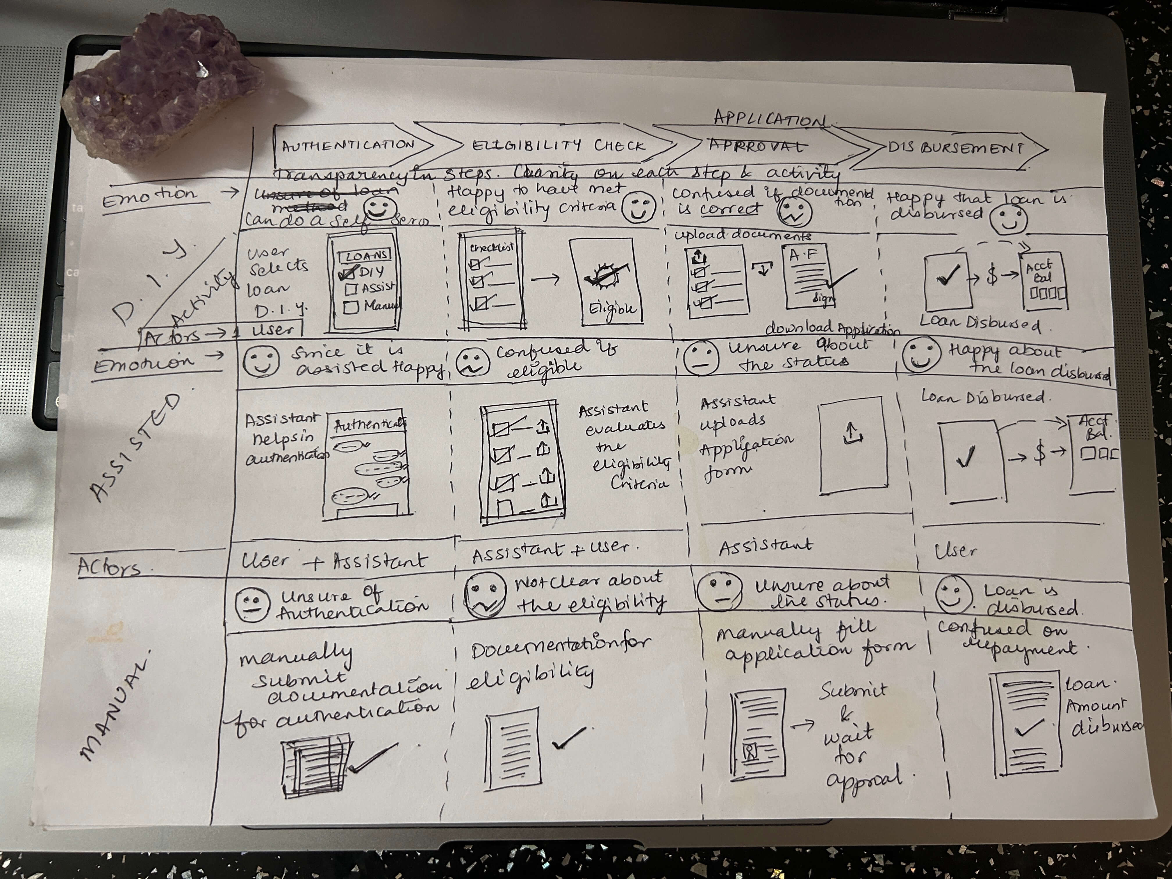 Loan applications are often a complex, intimidating process for customers. The financial institution wanted to introduce a DIY loan application journey that allowed users to apply for loans independently through an online platform, with the option for assistance via a chatbot or support agents when necessary. The challenge was to design an experience that was intuitive, user-friendly, and emotionally supportive throughout the journey.